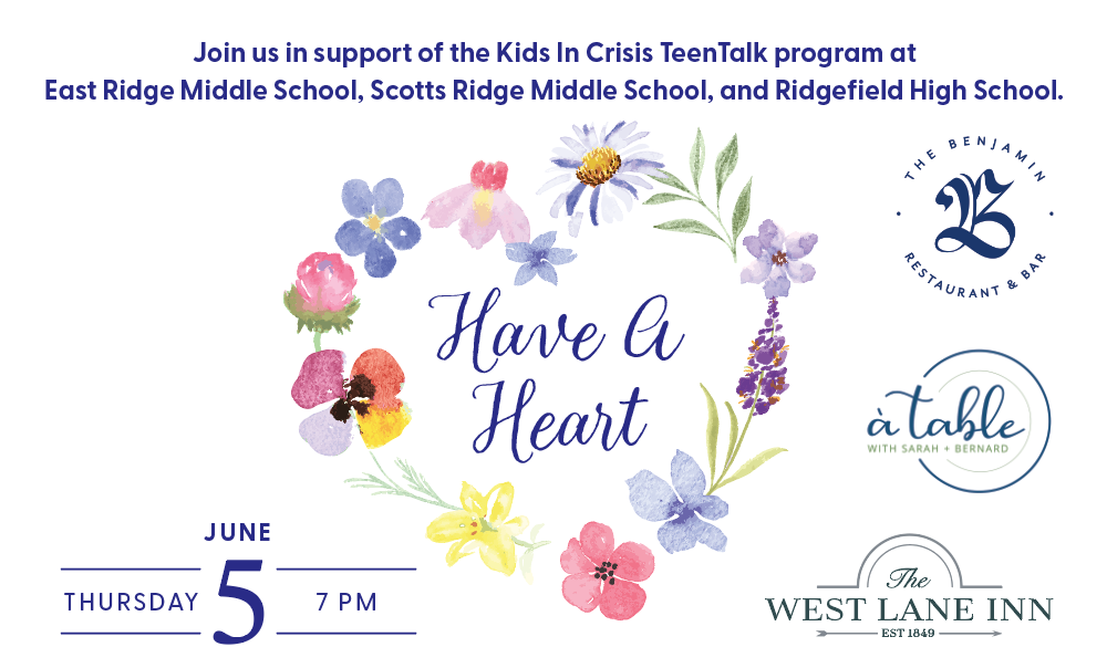 Have A Heart event co-chairs Kimberly Bishop, and Christine Wohl invite you to a garden party in support of the Ridgefield schools TeenTalk program. The Kids In Crisis TeenTalk program places Master’s-level mental health counselors in Fairfield County middle and high schools. Our trained, compassionate counselors help students navigate difficult personal, family, and school-related issues.